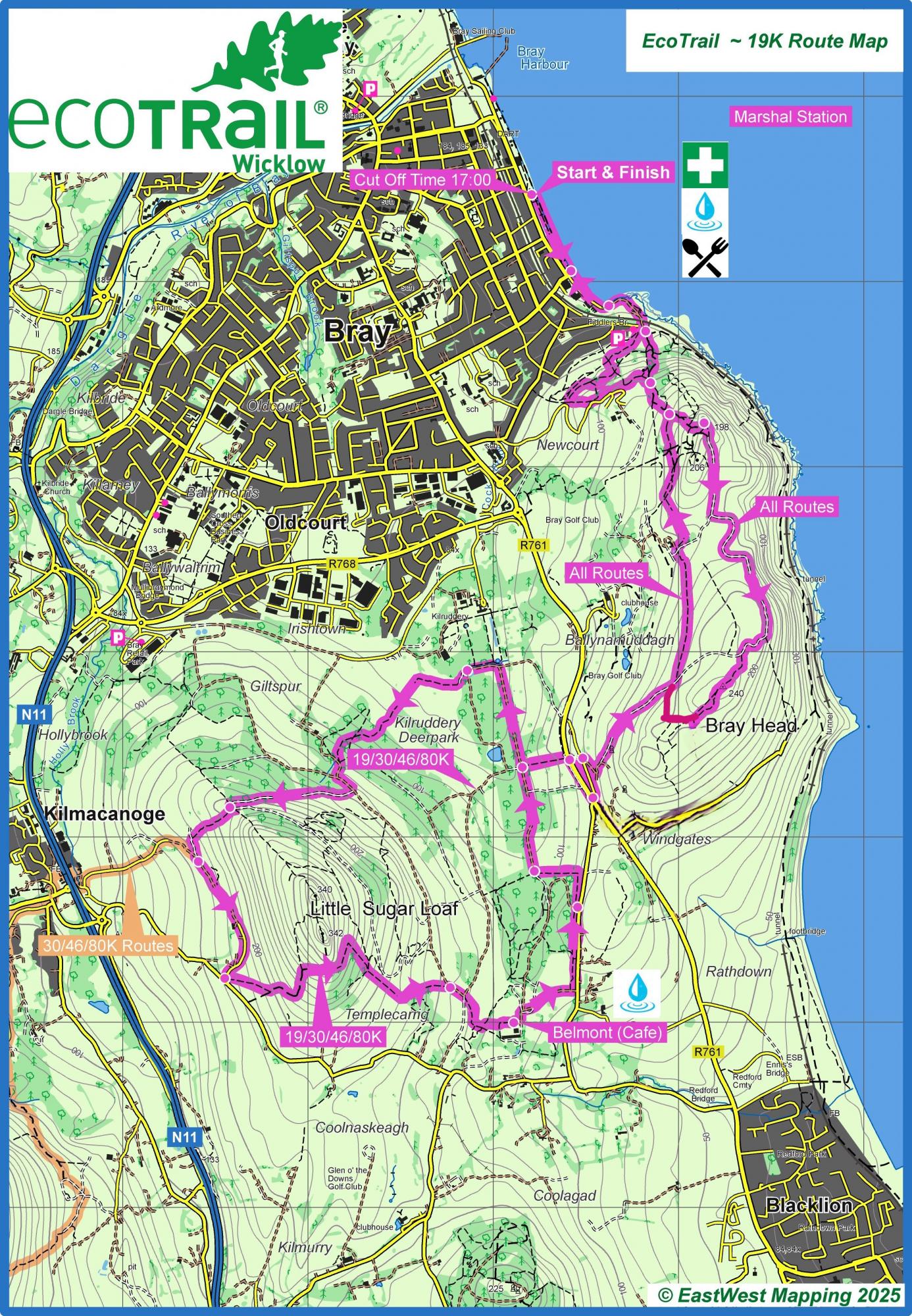 The 19 km route almost entirely on hard-packed trails with 3 short sections of rocky trails and only 2 very short road sections as you cross between Bray Head and the Little Sugarloaf.