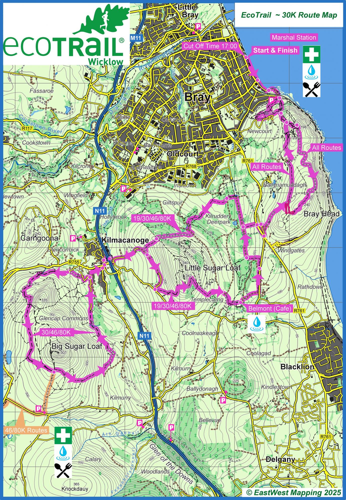 The 30km race continues to follow the longer race routes through Belmont out past both the Little and Great Sugarloaf mountains. After the Aid station (Km 14) on your return you will complete essentially a loop of both of these spectacular limestone peaks and returning to Bray Head via Belmont Estate (Water station at 24km ).